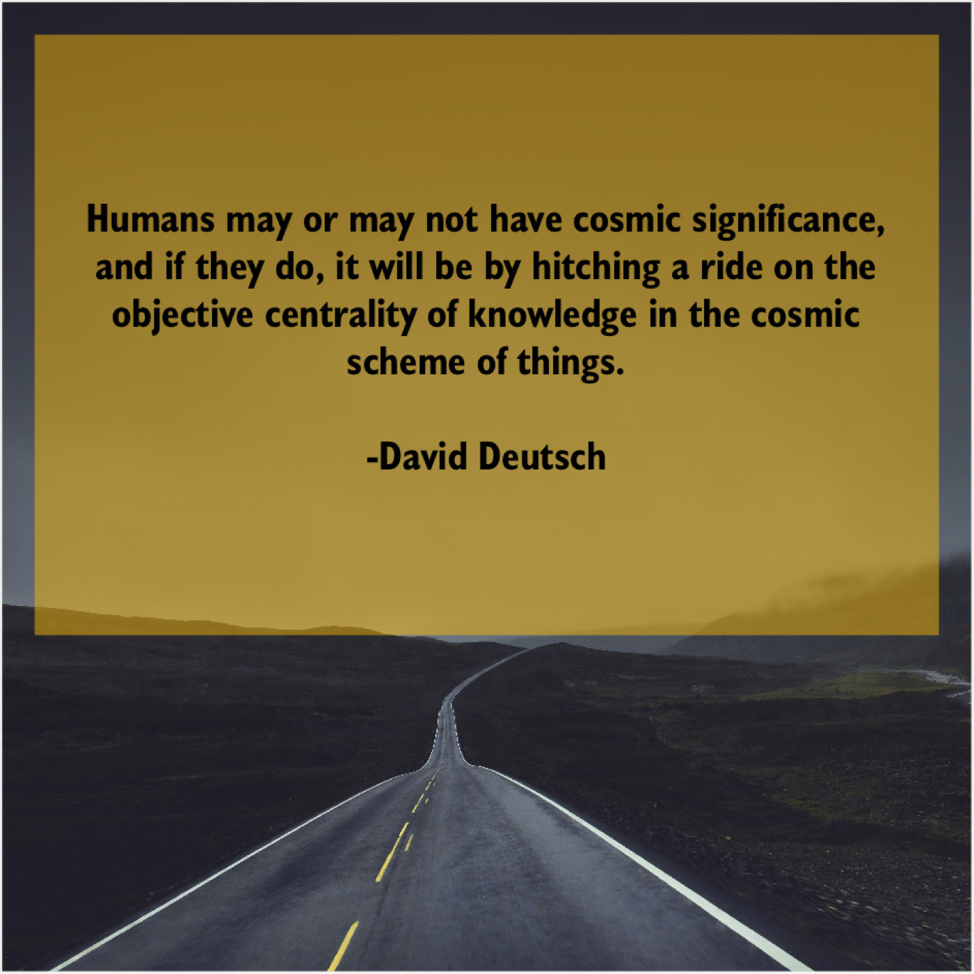 David Deutsch David Deutsch – Humans may or may not… September 8, 2019 admin “Humans may or may not have cosmic significance, and if they do, it will be by hitching a ride on the objective centrality of knowledge in the cosmic scheme of things.”-David Deutsch