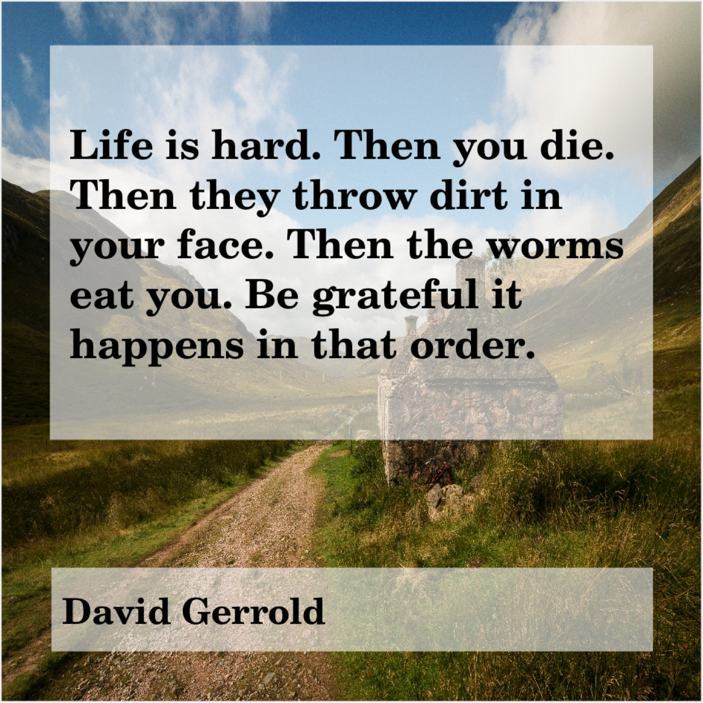 David Gerrold David Gerrold – Life is hard. Then you… March 2, 2019 admin “Life is hard. Then you die. Then they throw dirt in your face. Then the worms eat you. Be grateful it happens in that order.”-David Gerrold