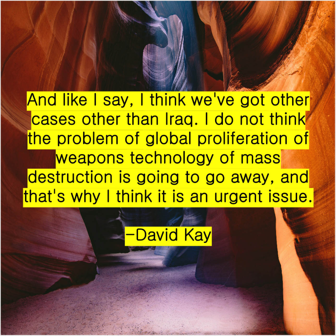 David Kay David Kay – And like I say, I… May 9, 2019 admin “And like I say, I think we’ve got other cases other than Iraq. I do not think the problem of global proliferation of weapons technology of mass destruction is going to go away, and that’s why I think it is an urgent issue.”-David Kay