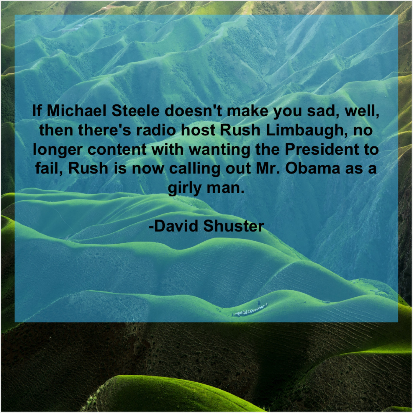David Shuster David Shuster – If Michael Steele doesn’t make… November 28, 2018 admin “If Michael Steele doesn’t make you sad, well, then there’s radio host Rush Limbaugh, no longer content with wanting the President to fail, Rush is now calling out Mr. Obama as a girly man.”-David Shuster