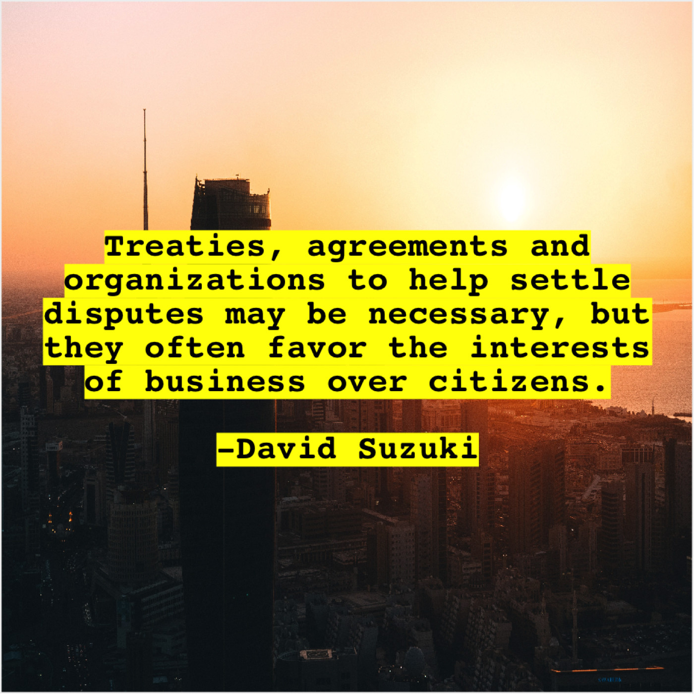 David Suzuki David Suzuki – Treaties, agreements and organizations to… May 26, 2019 admin “Treaties, agreements and organizations to help settle disputes may be necessary, but they often favor the interests of business over citizens.”-David Suzuki