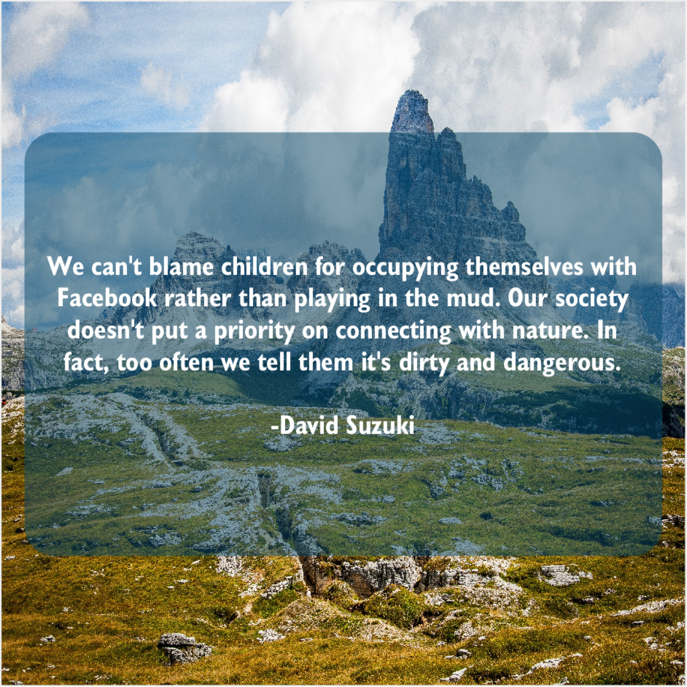 David Suzuki David Suzuki – We can’t blame children for… December 28, 2018 admin “We can’t blame children for occupying themselves with Facebook rather than playing in the mud. Our society doesn’t put a priority on connecting with nature. In fact, too often we tell them it’s dirty and dangerous.”-David Suzuki
