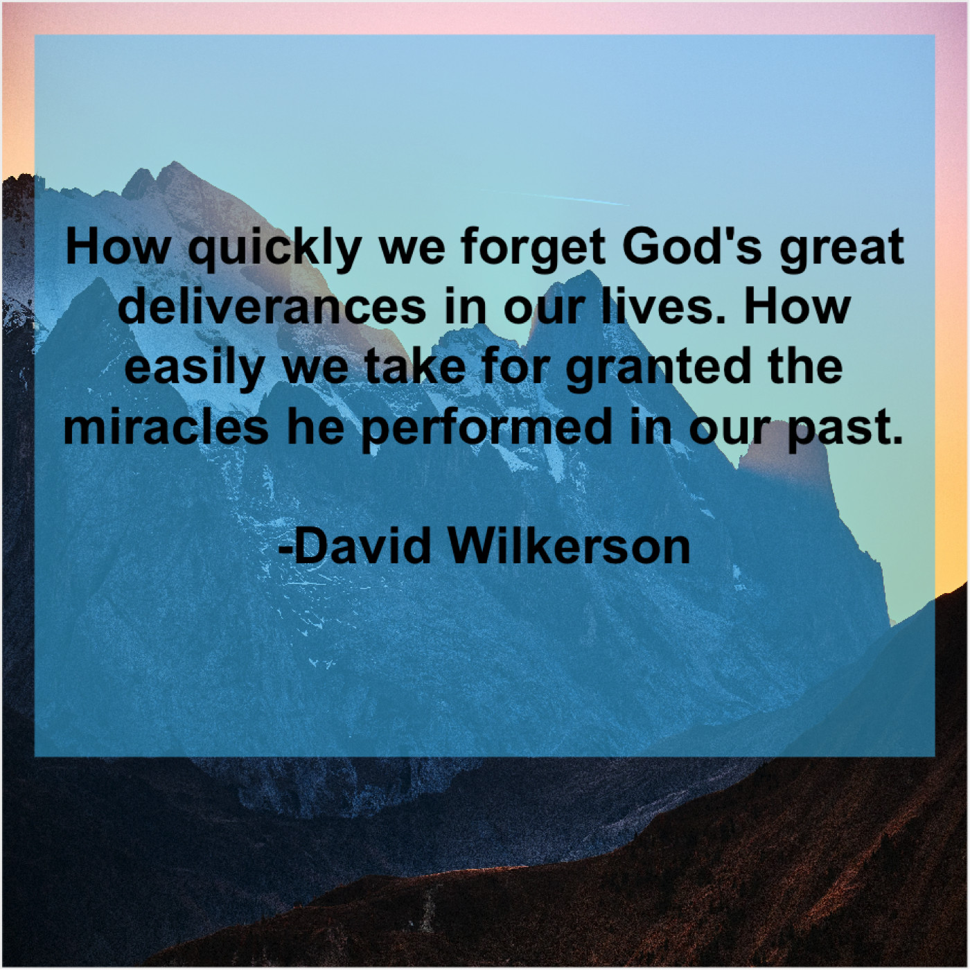 David Wilkerson David Wilkerson – How quickly we forget God’s… September 20, 2019 admin “How quickly we forget God’s great deliverances in our lives. How easily we take for granted the miracles he performed in our past.”-David Wilkerson