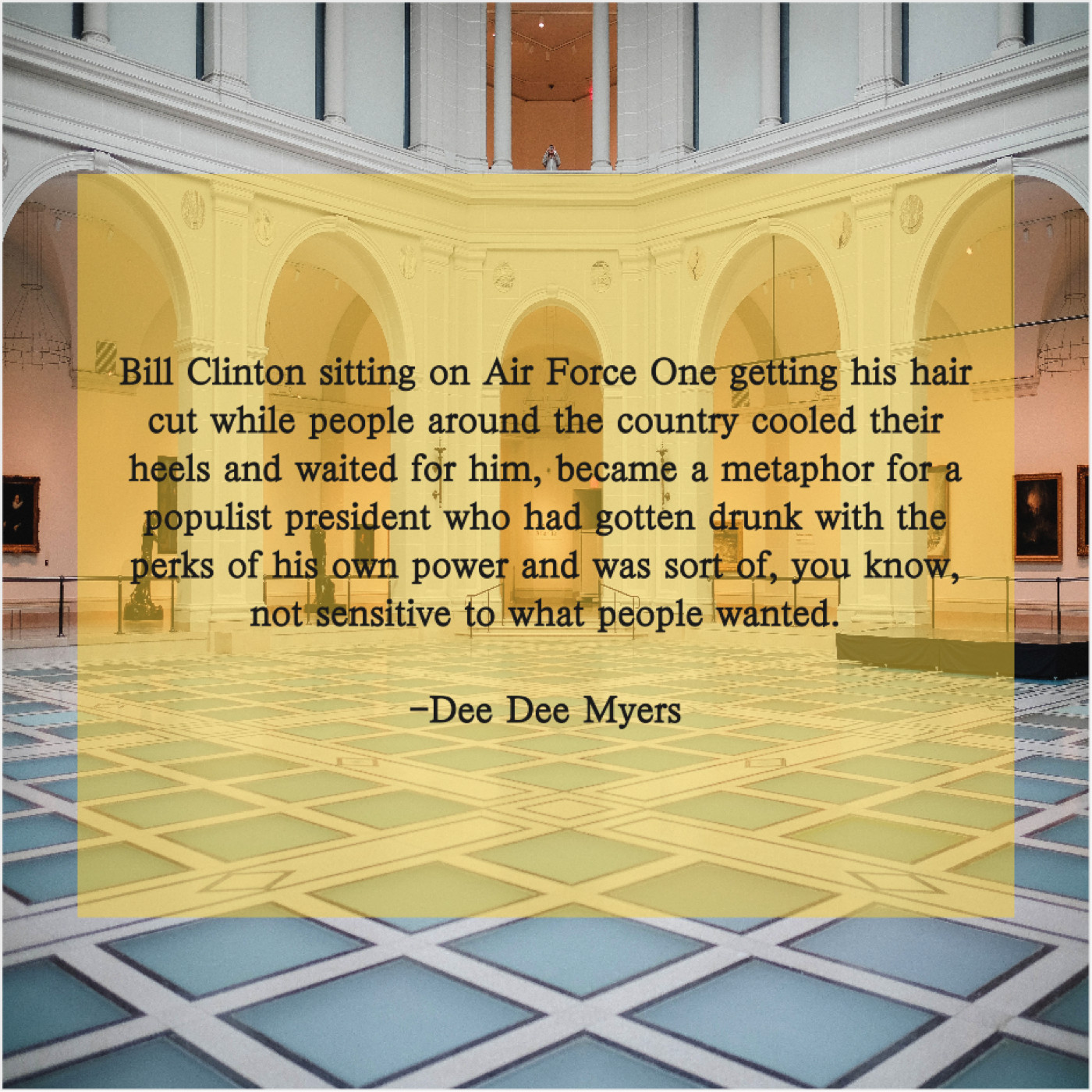 “Bill Clinton sitting on Air Force One getting his hair cut while people around the country cooled their heels and waited for him, became a metaphor for a populist president who had gotten drunk with the perks of his own power and was sort of, you know, not sensitive to what people wanted.”