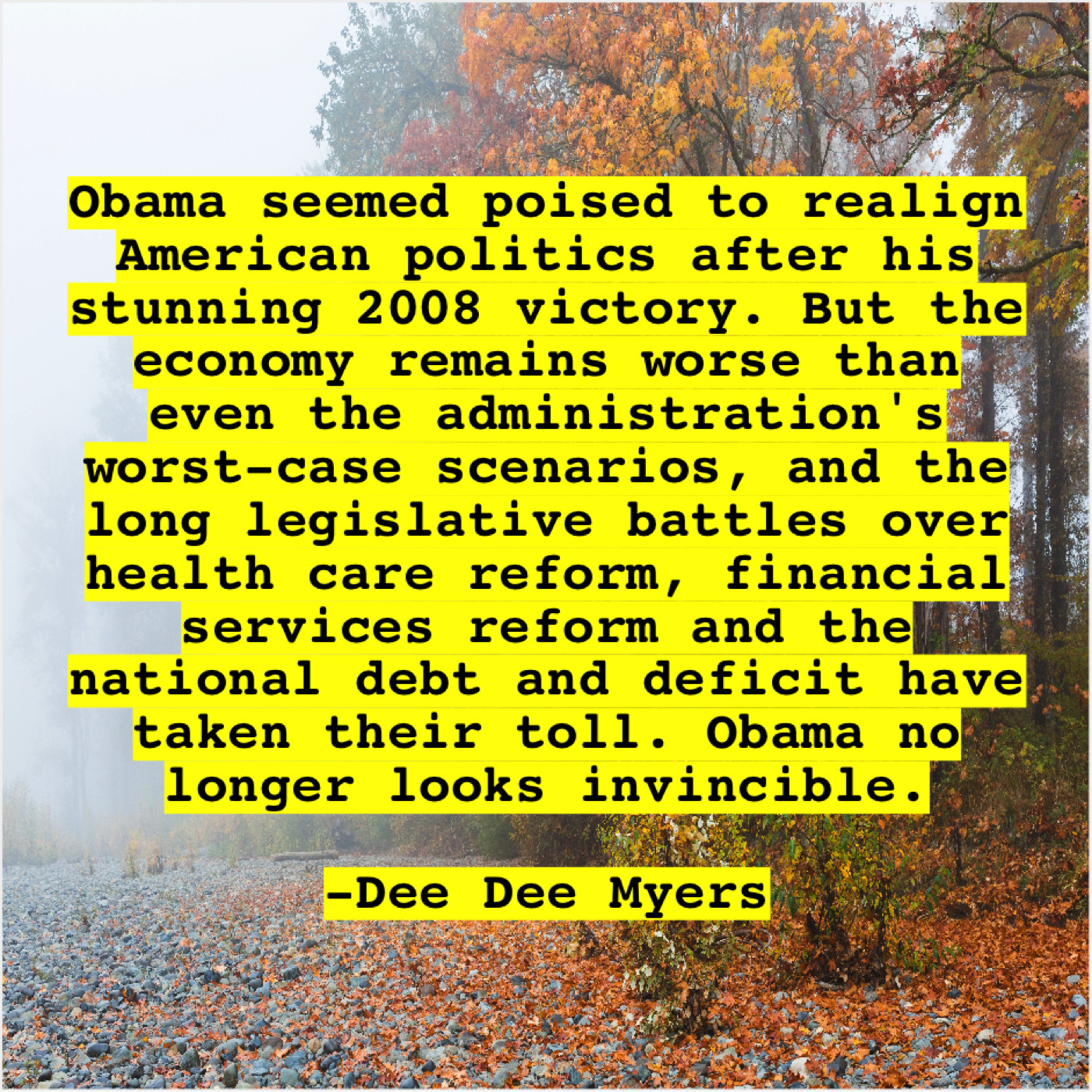 “Obama seemed poised to realign American politics after his stunning 2008 victory. But the economy remains worse than even the administration’s worst-case scenarios, and the long legislative battles over health care reform, financial services reform and the national debt and deficit have taken their toll. Obama no longer looks invincible.”