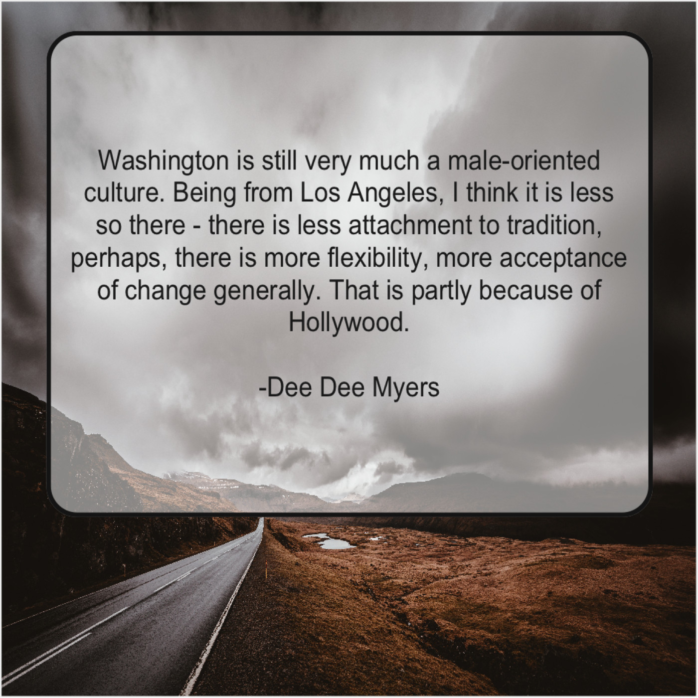 “Washington is still very much a male-oriented culture. Being from Los Angeles, I think it is less so there – there is less attachment to tradition, perhaps, there is more flexibility, more acceptance of change generally. That is partly because of Hollywood.”