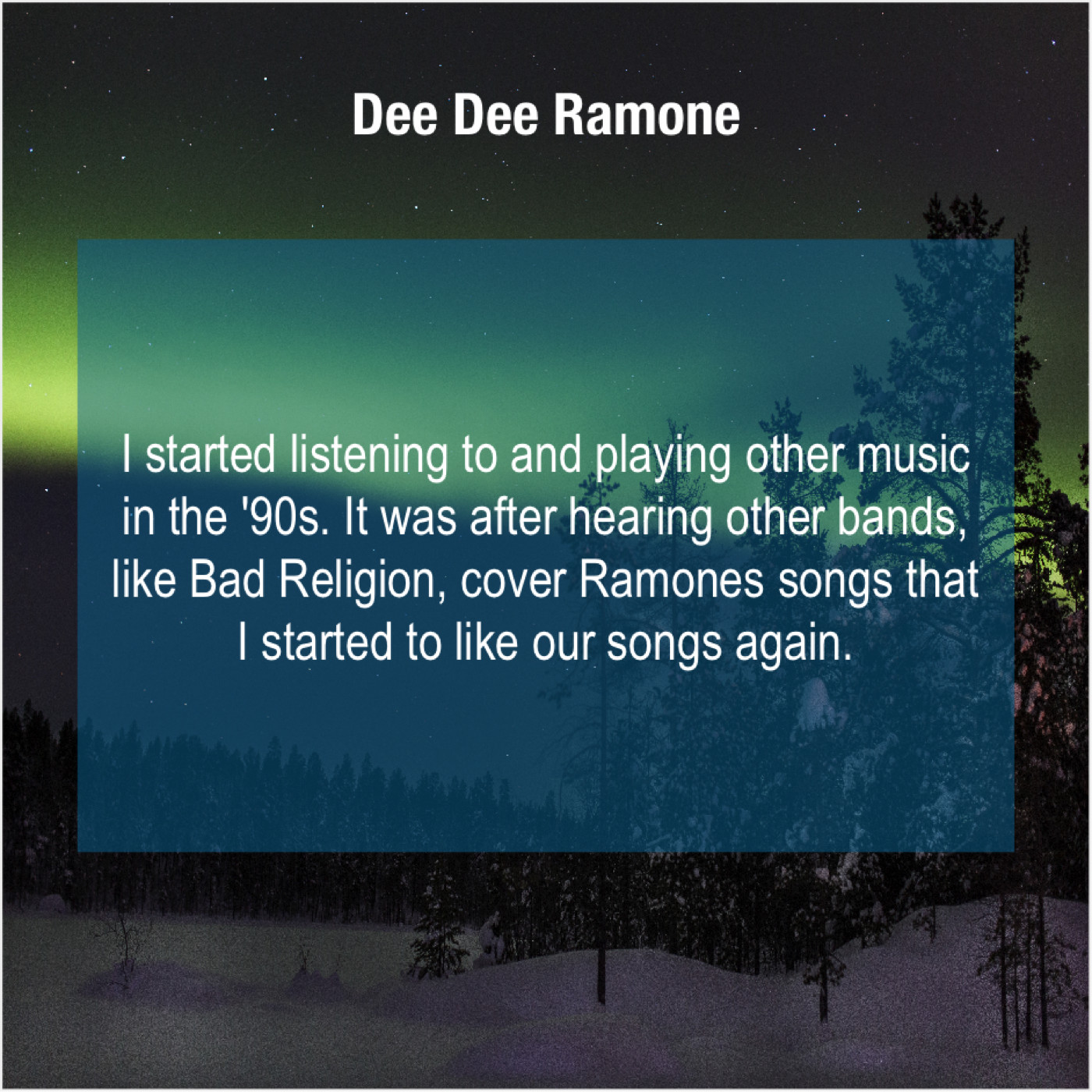 Dee Dee Ramone Dee Dee Ramone – I started listening to and… December 25, 2018 admin “I started listening to and playing other music in the ’90s. It was after hearing other bands, like Bad Religion, cover Ramones songs that I started to like our songs again.”-Dee Dee Ramone