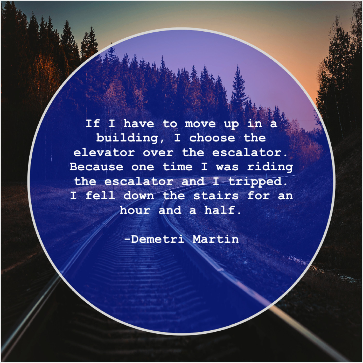 Demetri Martin Demetri Martin – If I have to move… April 27, 2019 admin “If I have to move up in a building, I choose the elevator over the escalator. Because one time I was riding the escalator and I tripped. I fell down the stairs for an hour and a half.”-Demetri Martin