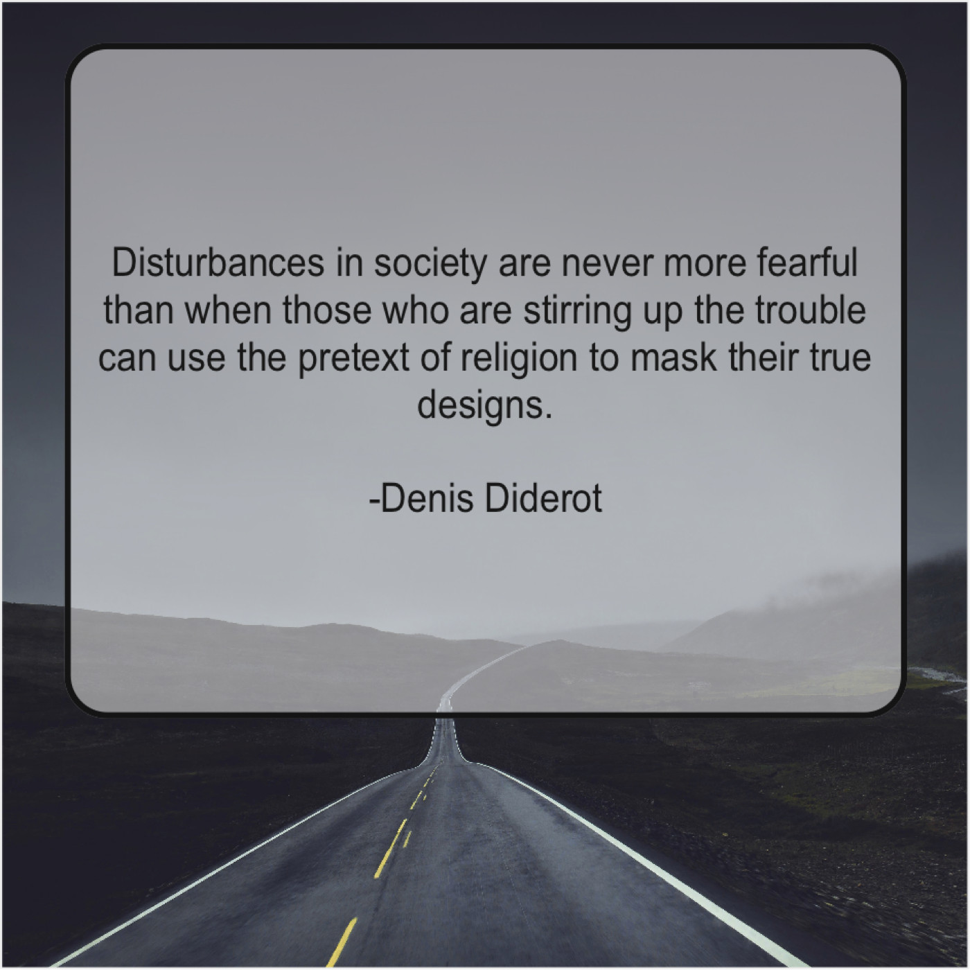 Denis Diderot Denis Diderot – Disturbances in society are never… March 16, 2019 admin “Disturbances in society are never more fearful than when those who are stirring up the trouble can use the pretext of religion to mask their true designs.”-Denis Diderot