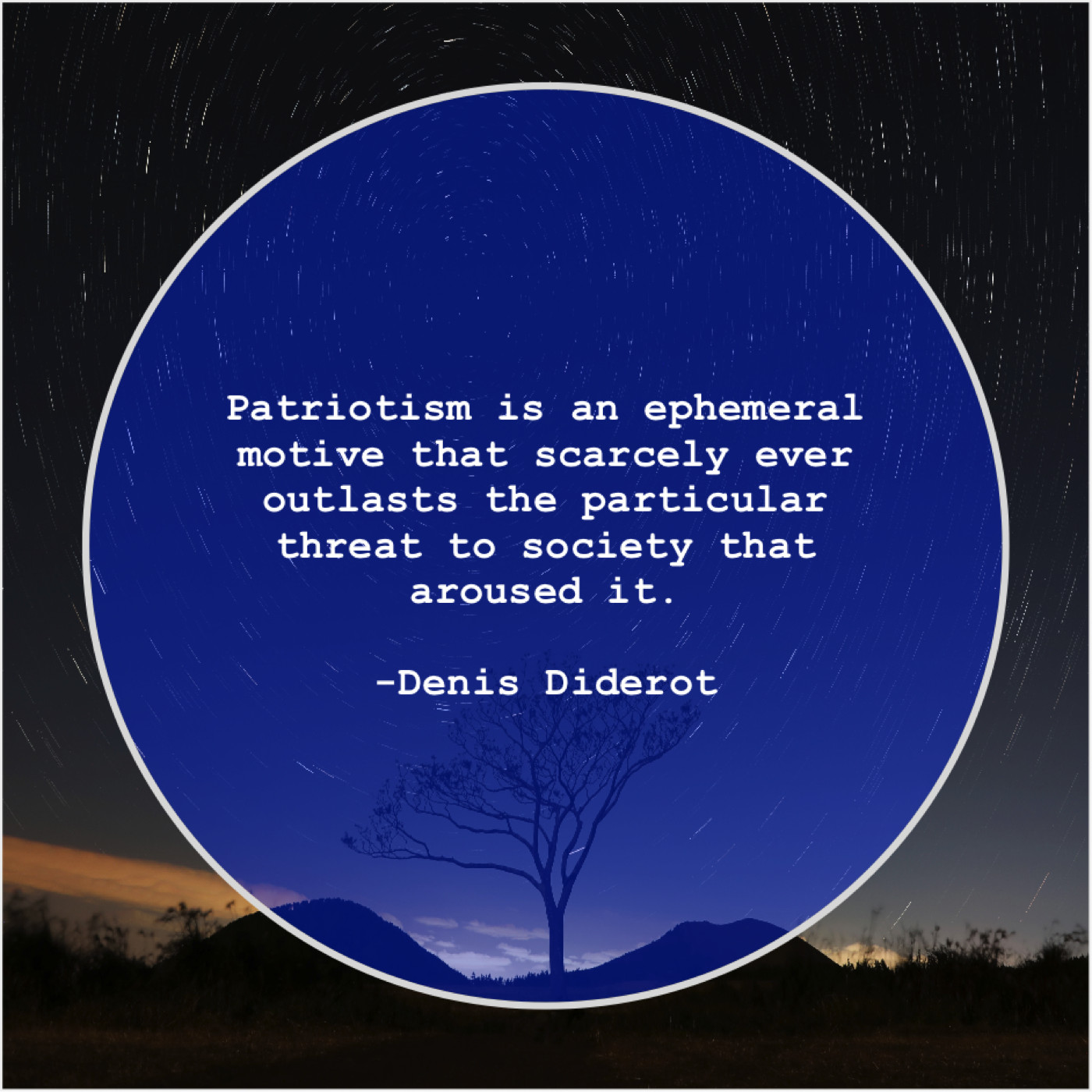 Denis Diderot Denis Diderot – Patriotism is an ephemeral motive… November 21, 2018 admin “Patriotism is an ephemeral motive that scarcely ever outlasts the particular threat to society that aroused it.”-Denis Diderot