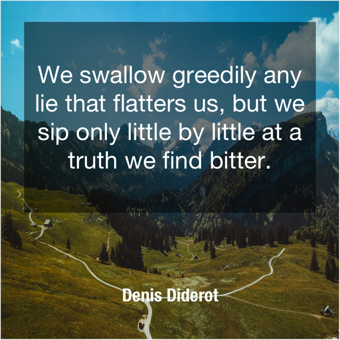 Denis Diderot Denis Diderot – We swallow greedily any lie… February 17, 2019 admin “We swallow greedily any lie that flatters us, but we sip only little by little at a truth we find bitter.”-Denis Diderot