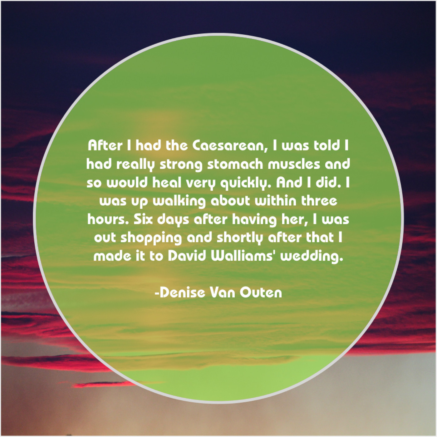 “After I had the Caesarean, I was told I had really strong stomach muscles and so would heal very quickly. And I did. I was up walking about within three hours. Six days after having her, I was out shopping and shortly after that I made it to David Walliams’ wedding.”