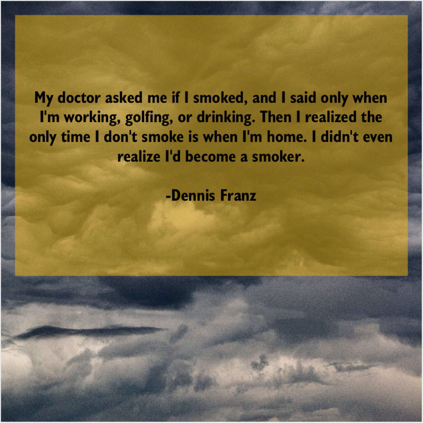 Dennis Franz Dennis Franz – My doctor asked me if… October 20, 2019 admin “My doctor asked me if I smoked, and I said only when I’m working, golfing, or drinking. Then I realized the only time I don’t smoke is when I’m home. I didn’t even realize I’d become a smoker.”-Dennis Franz