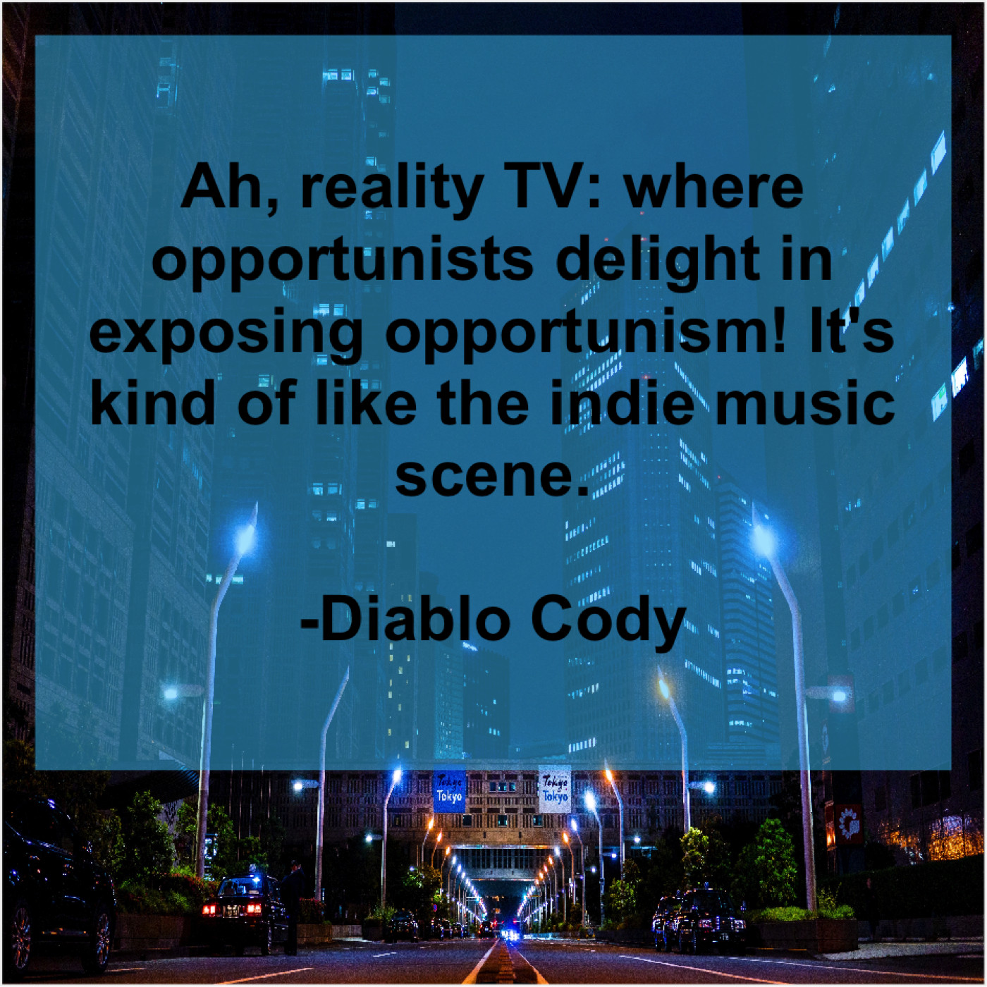 Diablo Cody Diablo Cody – Ah, reality TV: where opportunists… September 4, 2019 admin “Ah, reality TV: where opportunists delight in exposing opportunism! It’s kind of like the indie music scene.”-Diablo Cody