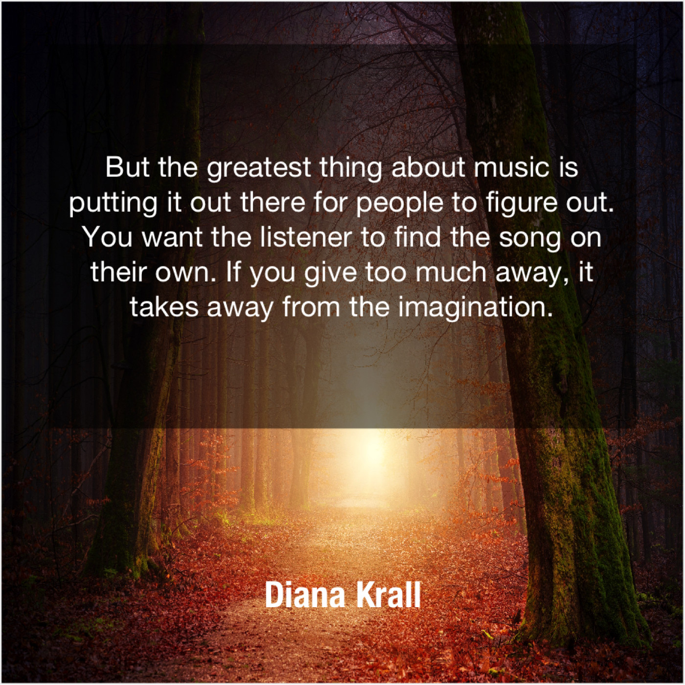 Diana Krall Diana Krall – But the greatest thing about… May 1, 2019 admin “But the greatest thing about music is putting it out there for people to figure out. You want the listener to find the song on their own. If you give too much away, it takes away from the imagination.”-Diana Krall
