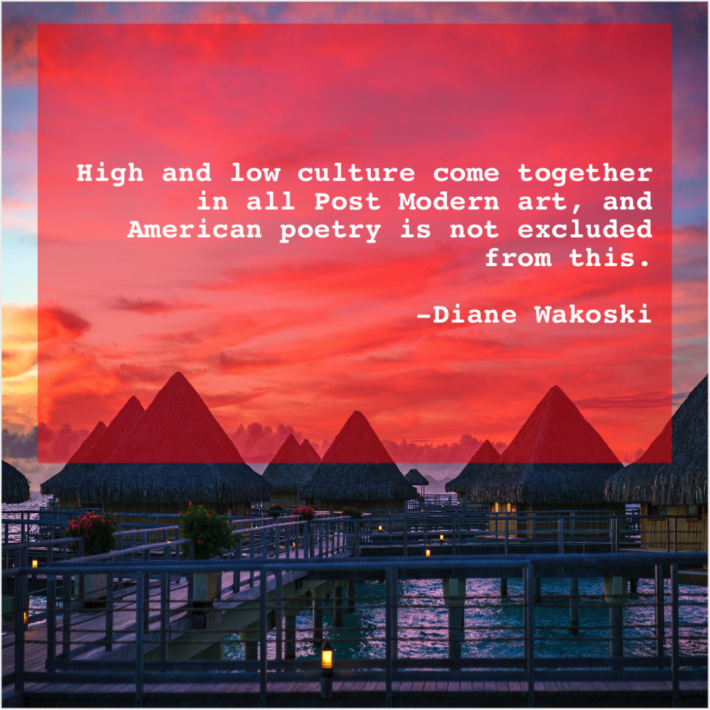 Diane Wakoski Diane Wakoski – High and low culture come… November 1, 2018 admin “High and low culture come together in all Post Modern art, and American poetry is not excluded from this.”-Diane Wakoski