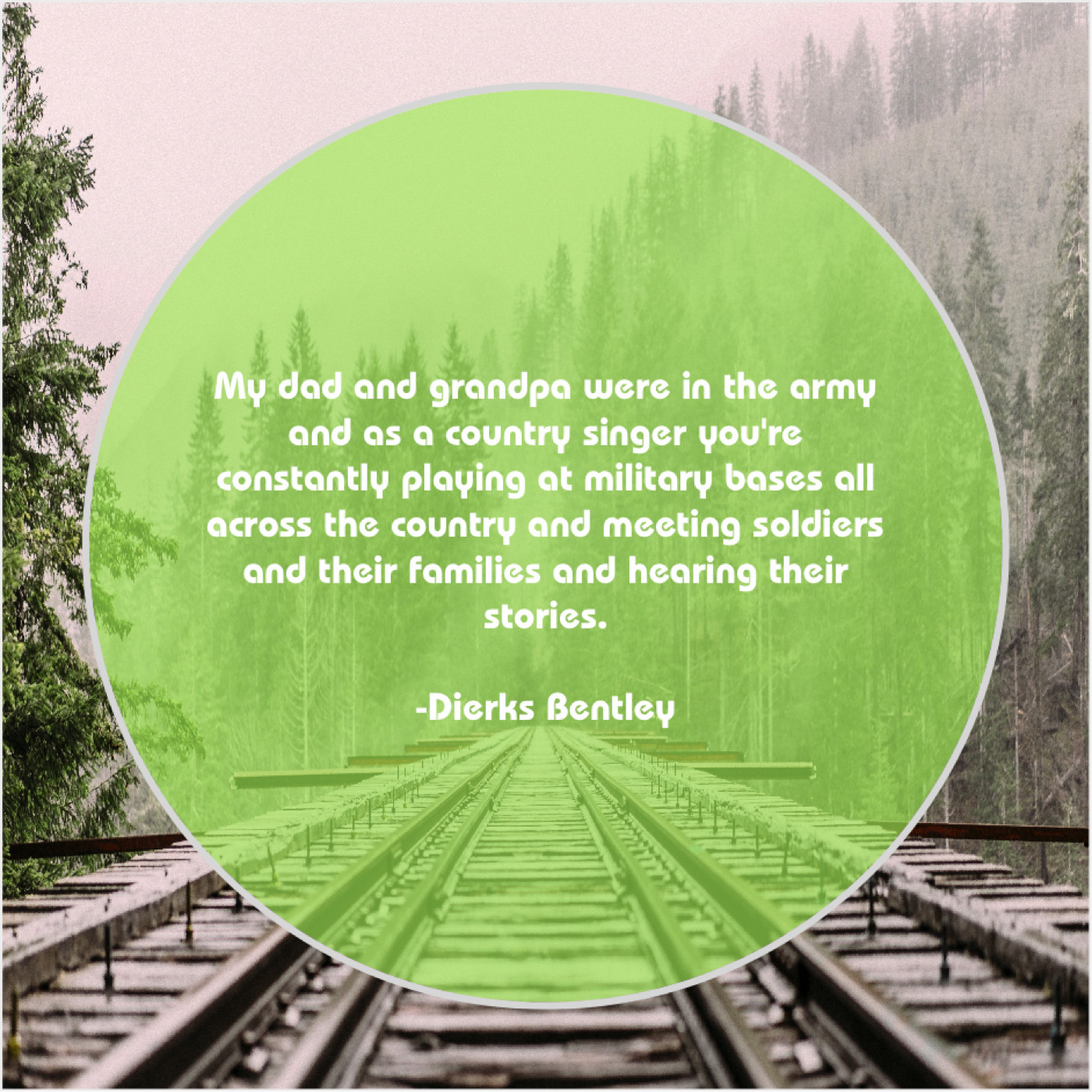 Dierks Bentley Dierks Bentley – My dad and grandpa were… August 17, 2019 admin “My dad and grandpa were in the army and as a country singer you’re constantly playing at military bases all across the country and meeting soldiers and their families and hearing their stories.”-Dierks Bentley