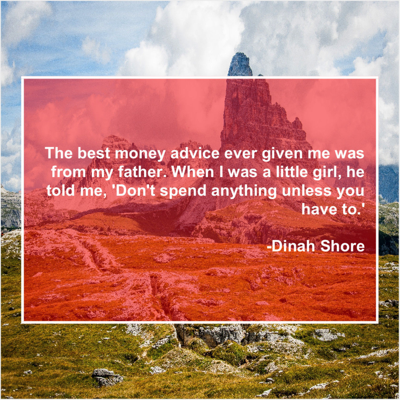 Dinah Shore Dinah Shore – The best money advice ever… July 4, 2019 admin “The best money advice ever given me was from my father. When I was a little girl, he told me, ‘Don’t spend anything unless you have to.'”-Dinah Shore
