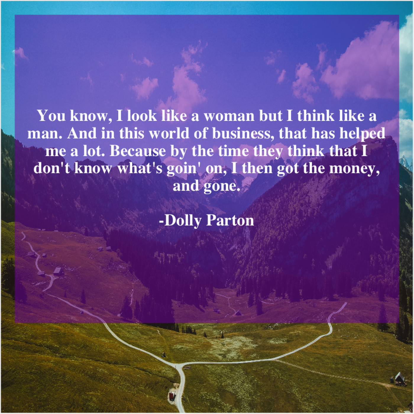 Dolly Parton Dolly Parton – You know, I look like… April 9, 2019 admin “You know, I look like a woman but I think like a man. And in this world of business, that has helped me a lot. Because by the time they think that I don’t know what’s goin’ on, I then got the money, and gone.”-Dolly Parton
