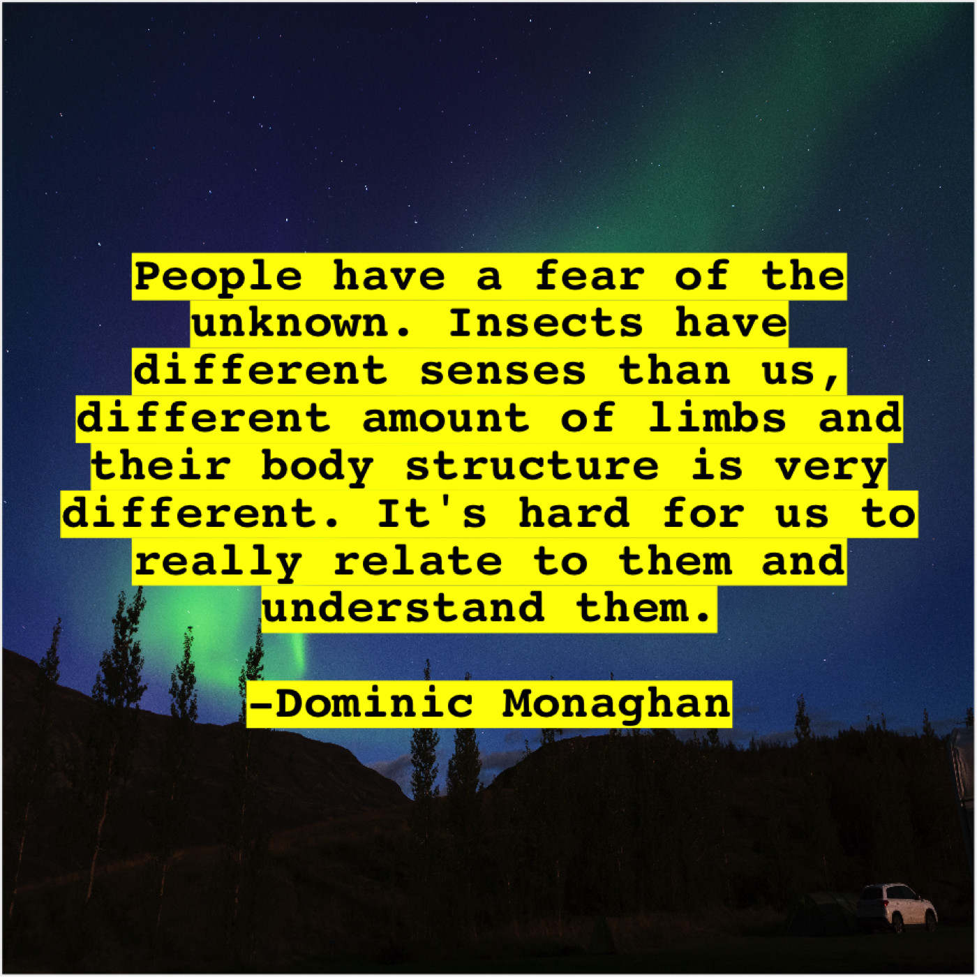 Dominic Monaghan Dominic Monaghan – People have a fear of… November 12, 2018 admin “People have a fear of the unknown. Insects have different senses than us, different amount of limbs and their body structure is very different. It’s hard for us to really relate to them and understand them.”-Dominic Monaghan