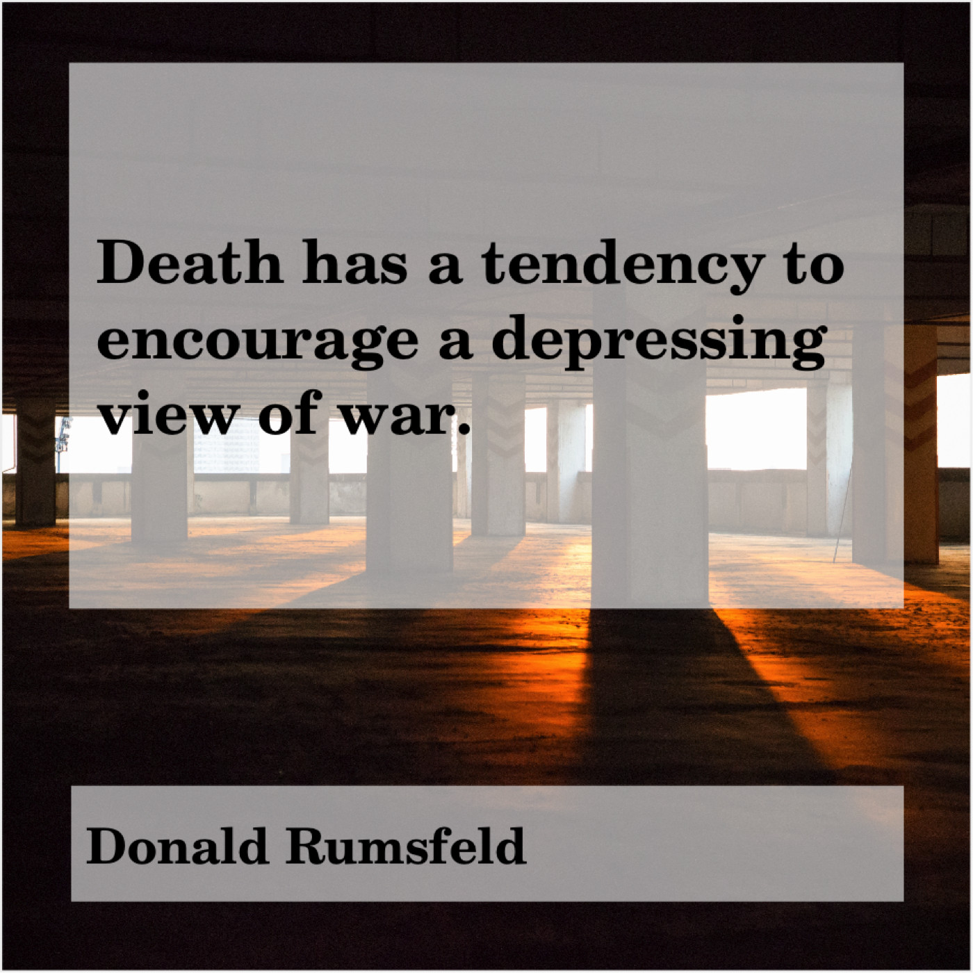 Donald Rumsfeld Donald Rumsfeld – Death has a tendency to… December 3, 2018 admin “Death has a tendency to encourage a depressing view of war.”-Donald Rumsfeld