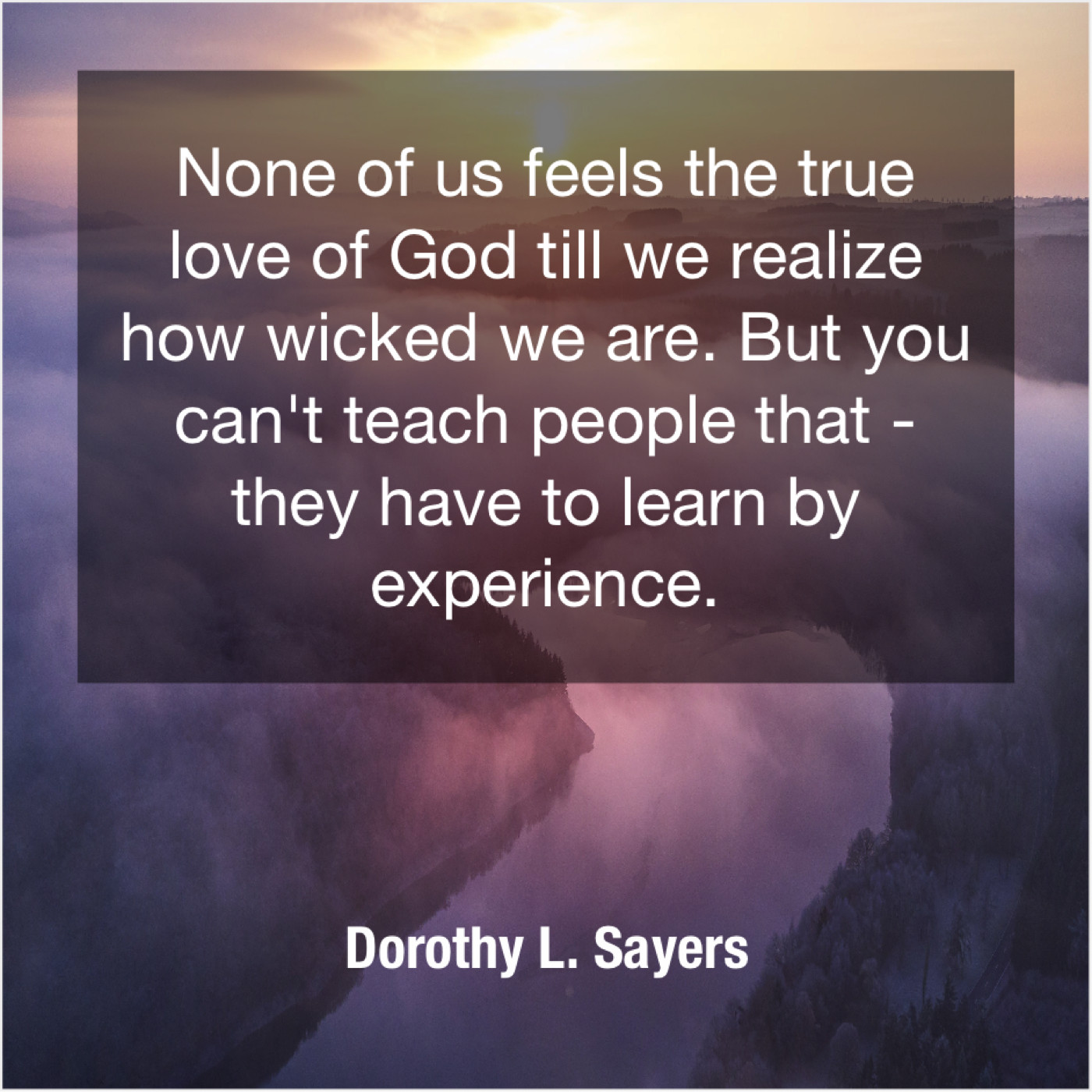 Dorothy L. Sayers Dorothy L. Sayers – None of us feels the… October 12, 2019 admin “None of us feels the true love of God till we realize how wicked we are. But you can’t teach people that – they have to learn by experience.”-Dorothy L. Sayers