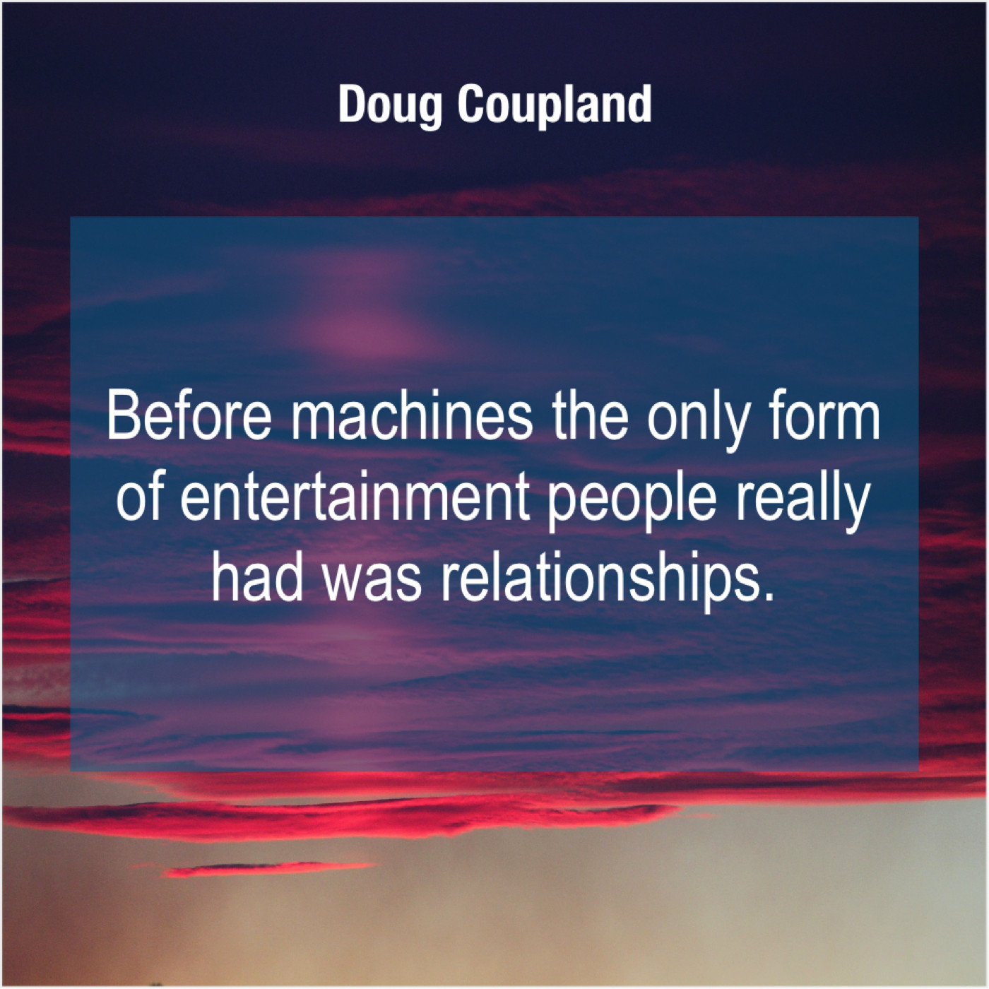 Doug Coupland Doug Coupland – Before machines the only form… April 1, 2019 admin “Before machines the only form of entertainment people really had was relationships.”-Doug Coupland