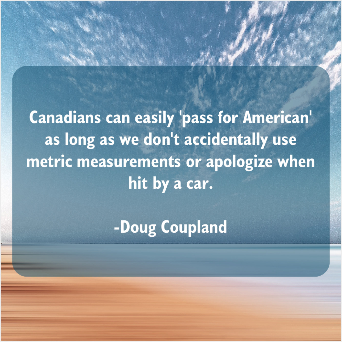 Doug Coupland Doug Coupland – Canadians can easily ‘pass for… February 6, 2019 admin “Canadians can easily ‘pass for American’ as long as we don’t accidentally use metric measurements or apologize when hit by a car.”-Doug Coupland