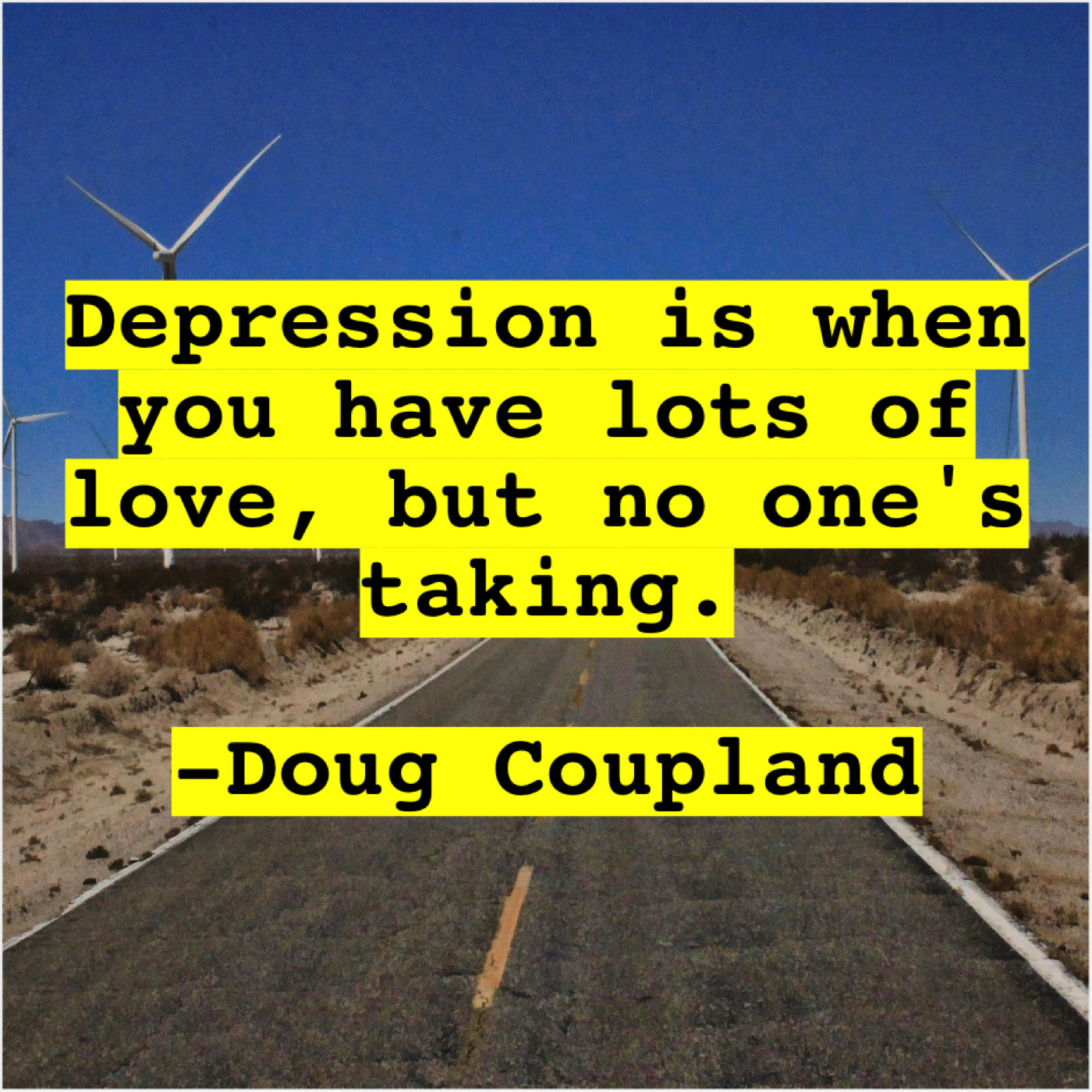 Doug Coupland Doug Coupland – Depression is when you have… July 1, 2019 admin “Depression is when you have lots of love, but no one’s taking.”-Doug Coupland