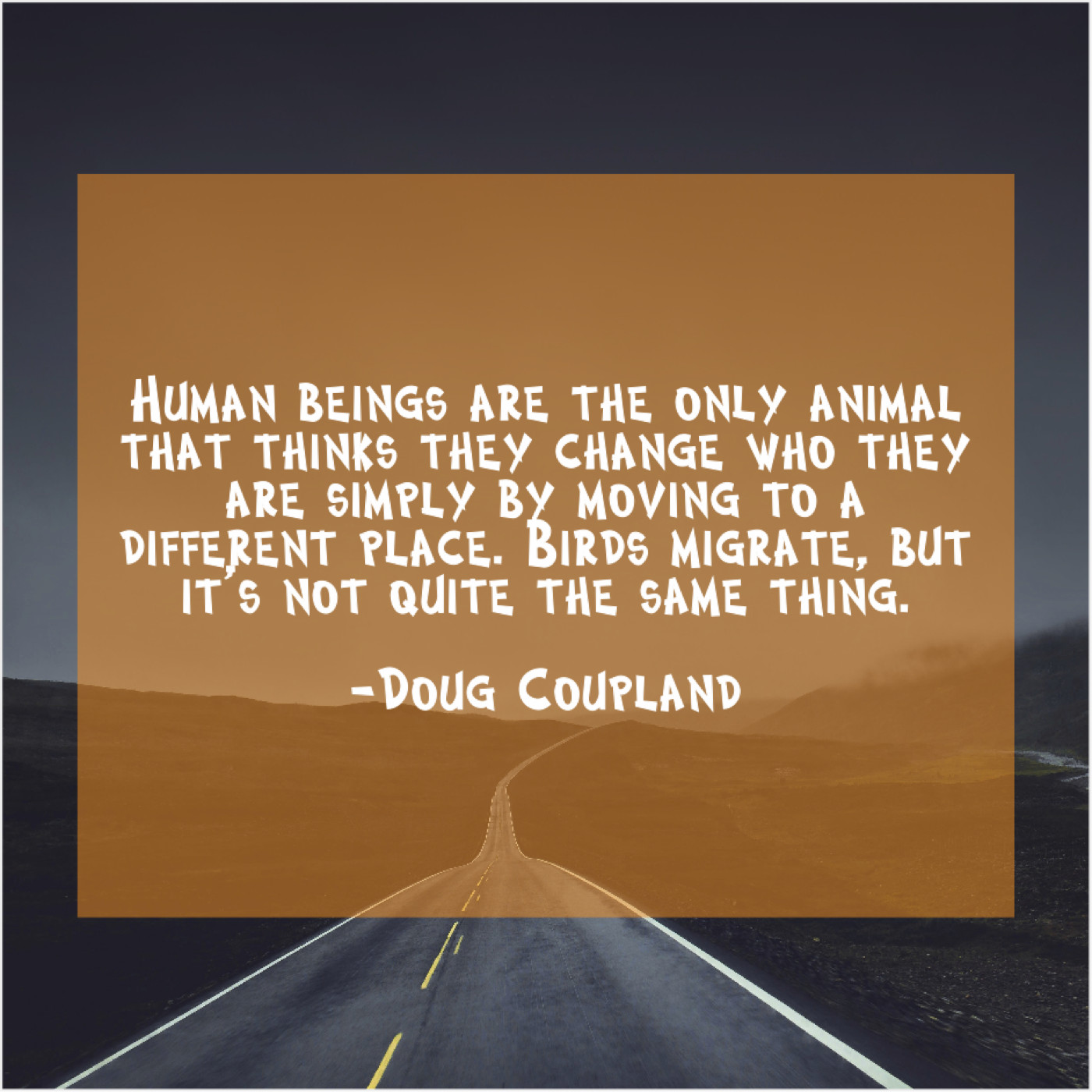 Doug Coupland Doug Coupland – Human beings are the only… June 12, 2019 admin “Human beings are the only animal that thinks they change who they are simply by moving to a different place. Birds migrate, but it’s not quite the same thing.”-Doug Coupland