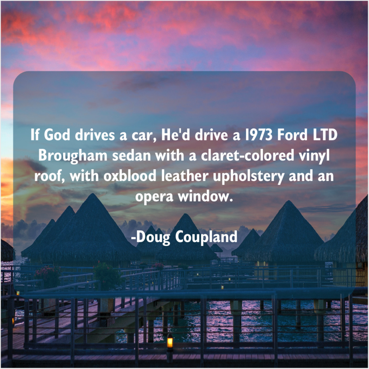 Doug Coupland Doug Coupland – If God drives a car… March 10, 2019 admin “If God drives a car, He’d drive a 1973 Ford LTD Brougham sedan with a claret-colored vinyl roof, with oxblood leather upholstery and an opera window.”-Doug Coupland
