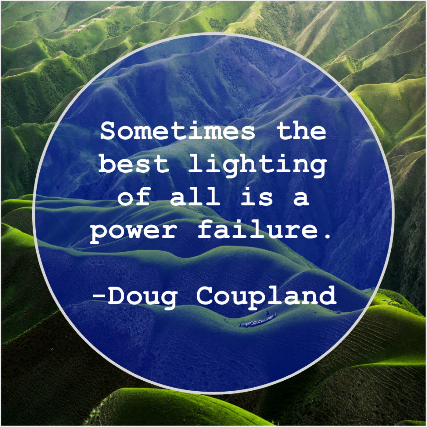 Doug Coupland Doug Coupland – Sometimes the best lighting of… March 24, 2019 admin “Sometimes the best lighting of all is a power failure.”-Doug Coupland