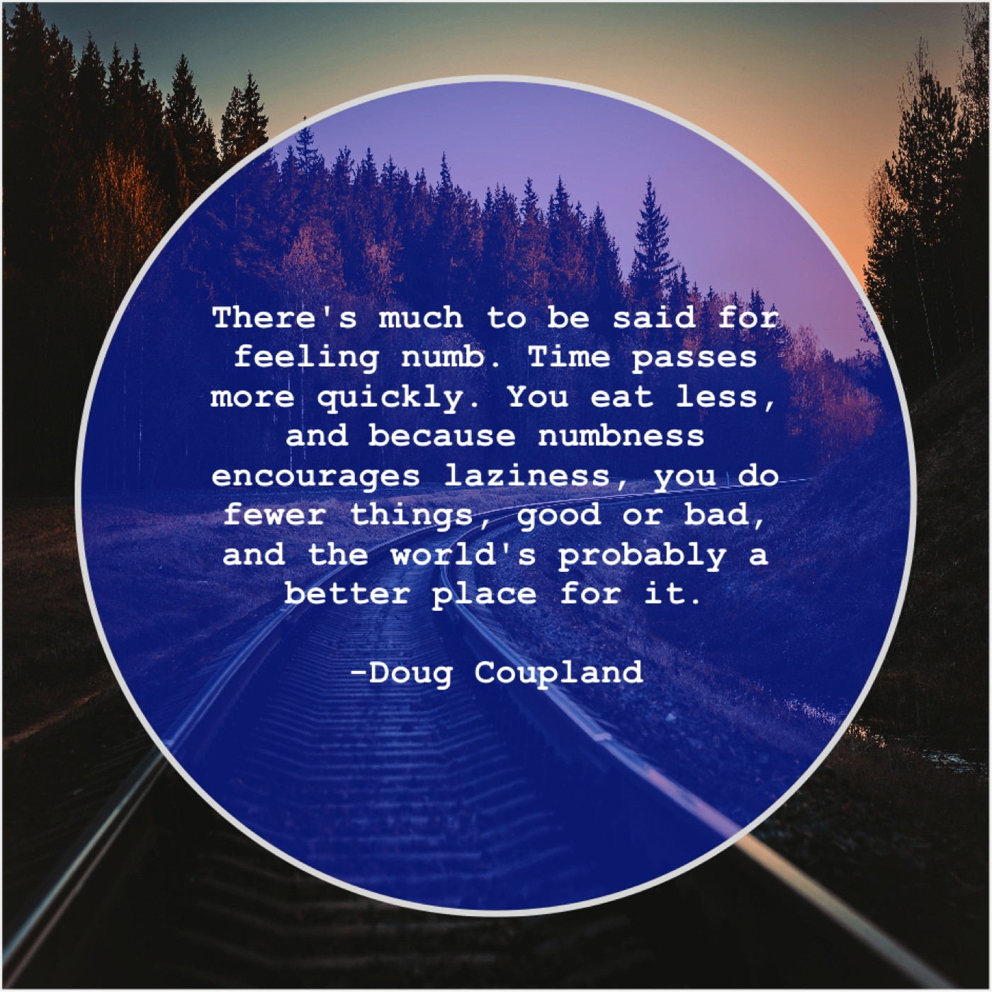 Doug Coupland Doug Coupland – There’s much to be said… January 12, 2019 admin “There’s much to be said for feeling numb. Time passes more quickly. You eat less, and because numbness encourages laziness, you do fewer things, good or bad, and the world’s probably a better place for it.”-Doug Coupland