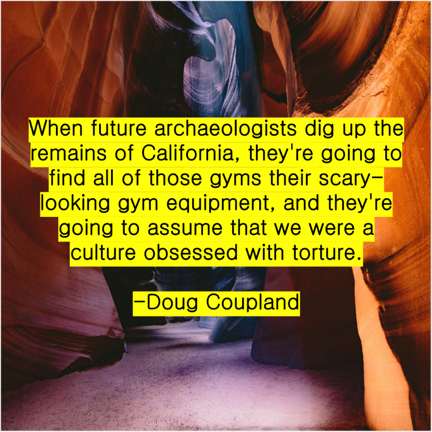 Doug Coupland Doug Coupland – When future archaeologists dig up… October 18, 2019 admin “When future archaeologists dig up the remains of California, they’re going to find all of those gyms their scary-looking gym equipment, and they’re going to assume that we were a culture obsessed with torture.”-Doug Coupland