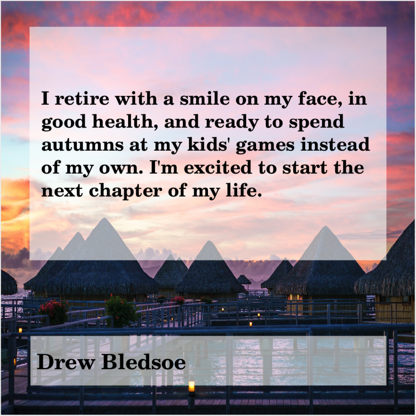 Drew Bledsoe Drew Bledsoe – I retire with a smile… January 8, 2019 admin “I retire with a smile on my face, in good health, and ready to spend autumns at my kids’ games instead of my own. I’m excited to start the next chapter of my life.”-Drew Bledsoe