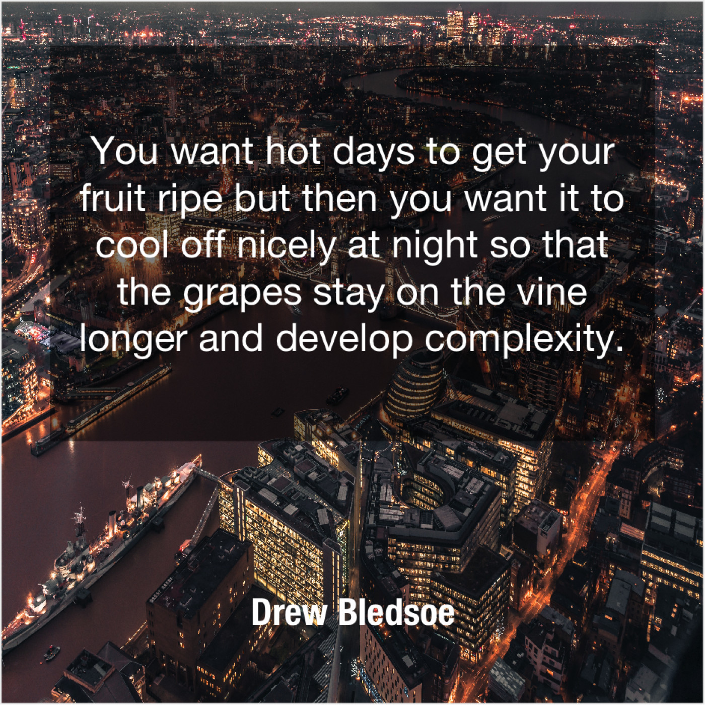 Drew Bledsoe Drew Bledsoe – You want hot days to… August 21, 2019 admin “You want hot days to get your fruit ripe but then you want it to cool off nicely at night so that the grapes stay on the vine longer and develop complexity.”-Drew Bledsoe