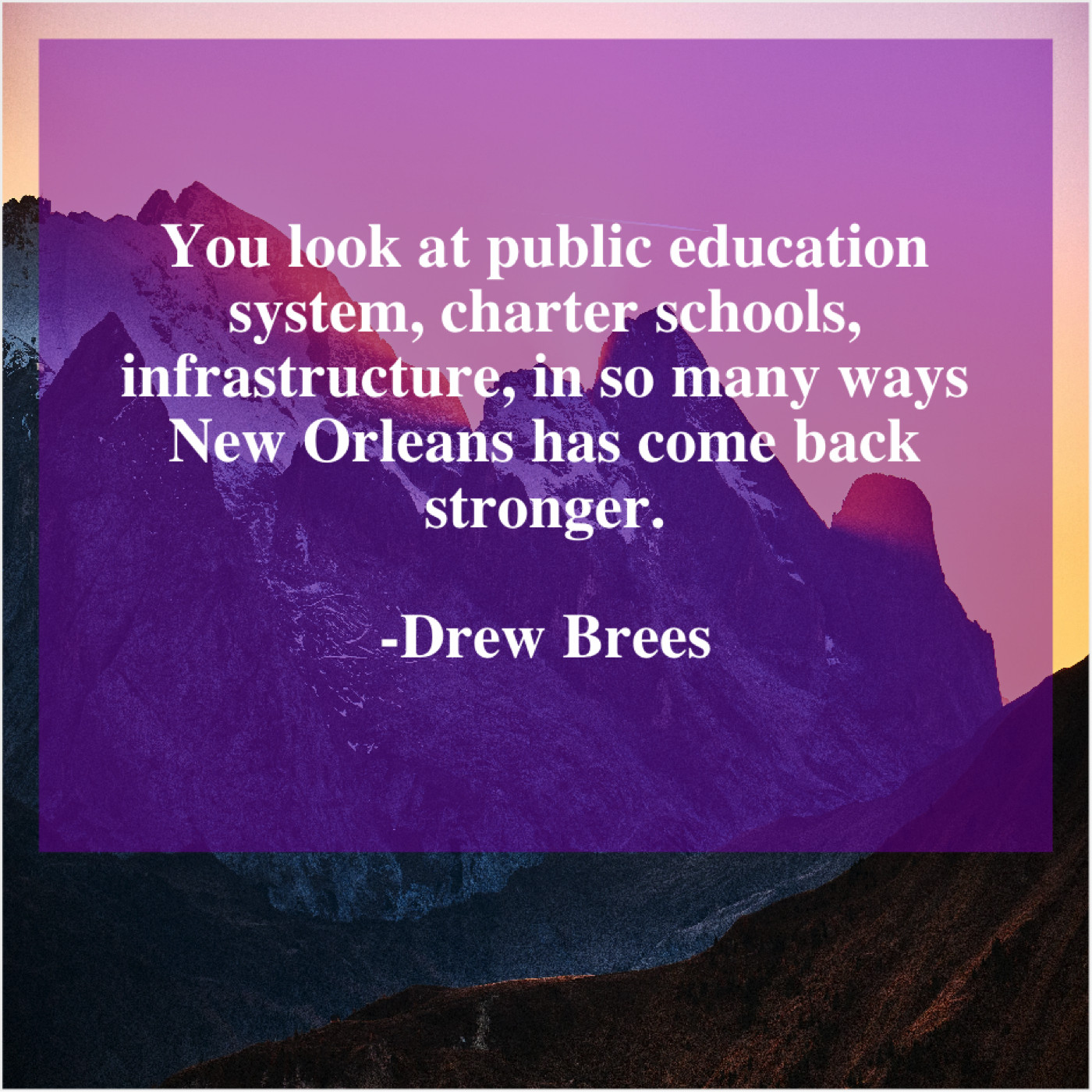 Drew Brees Drew Brees – You look at public education… December 11, 2018 admin “You look at public education system, charter schools, infrastructure, in so many ways New Orleans has come back stronger.”-Drew Brees