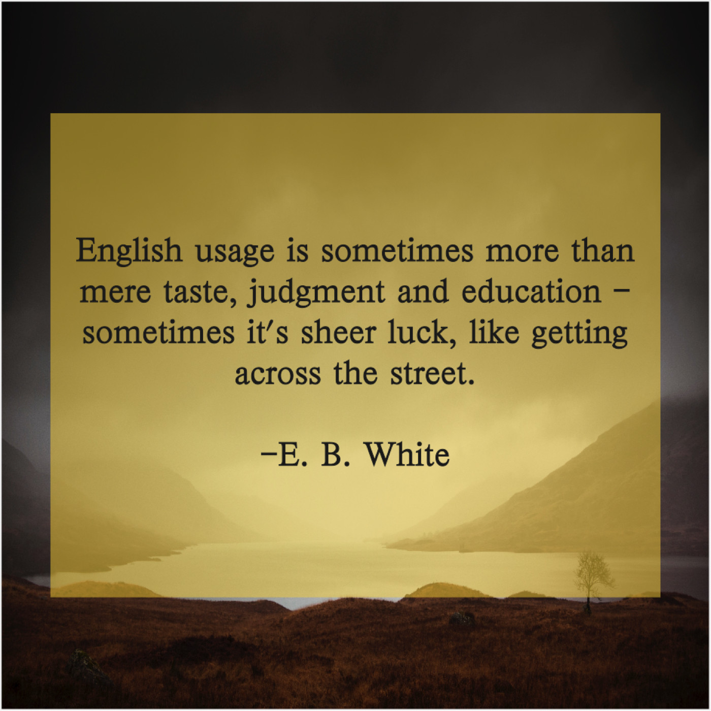E. B. White E. B. White – English usage is sometimes more… October 30, 2018 admin “English usage is sometimes more than mere taste, judgment and education – sometimes it’s sheer luck, like getting across the street.”-E. B. White
