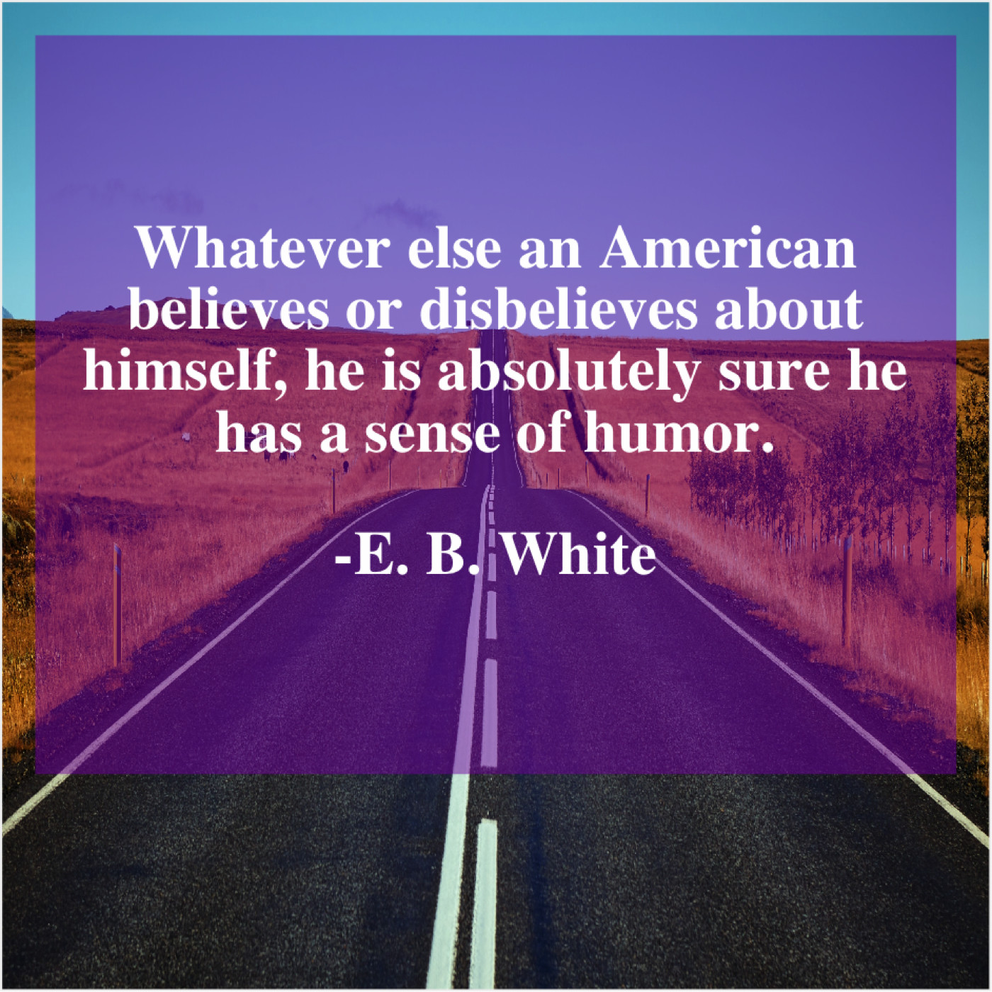 E. B. White E. B. White – Whatever else an American believes… January 27, 2019 admin “Whatever else an American believes or disbelieves about himself, he is absolutely sure he has a sense of humor.”-E. B. White