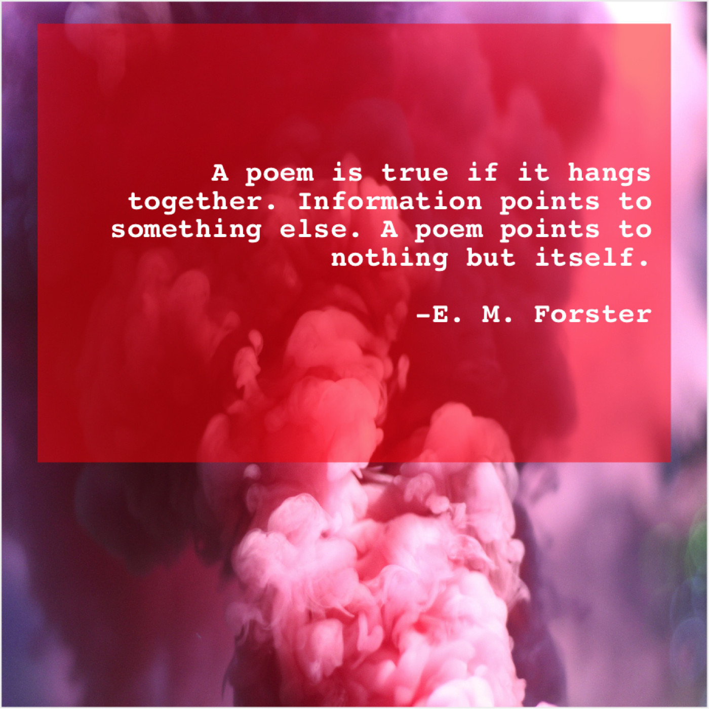 E. M. Forster E. M. Forster – A poem is true if… March 29, 2019 admin “A poem is true if it hangs together. Information points to something else. A poem points to nothing but itself.”-E. M. Forster