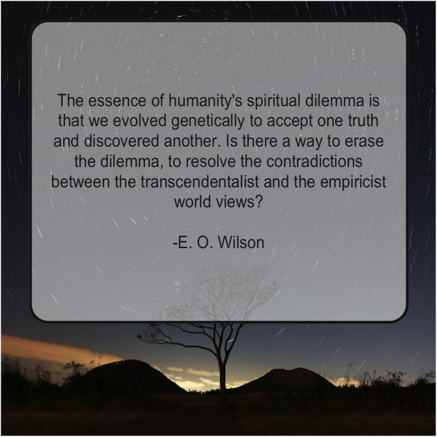 “The essence of humanity’s spiritual dilemma is that we evolved genetically to accept one truth and discovered another. Is there a way to erase the dilemma, to resolve the contradictions between the transcendentalist and the empiricist world views?”
