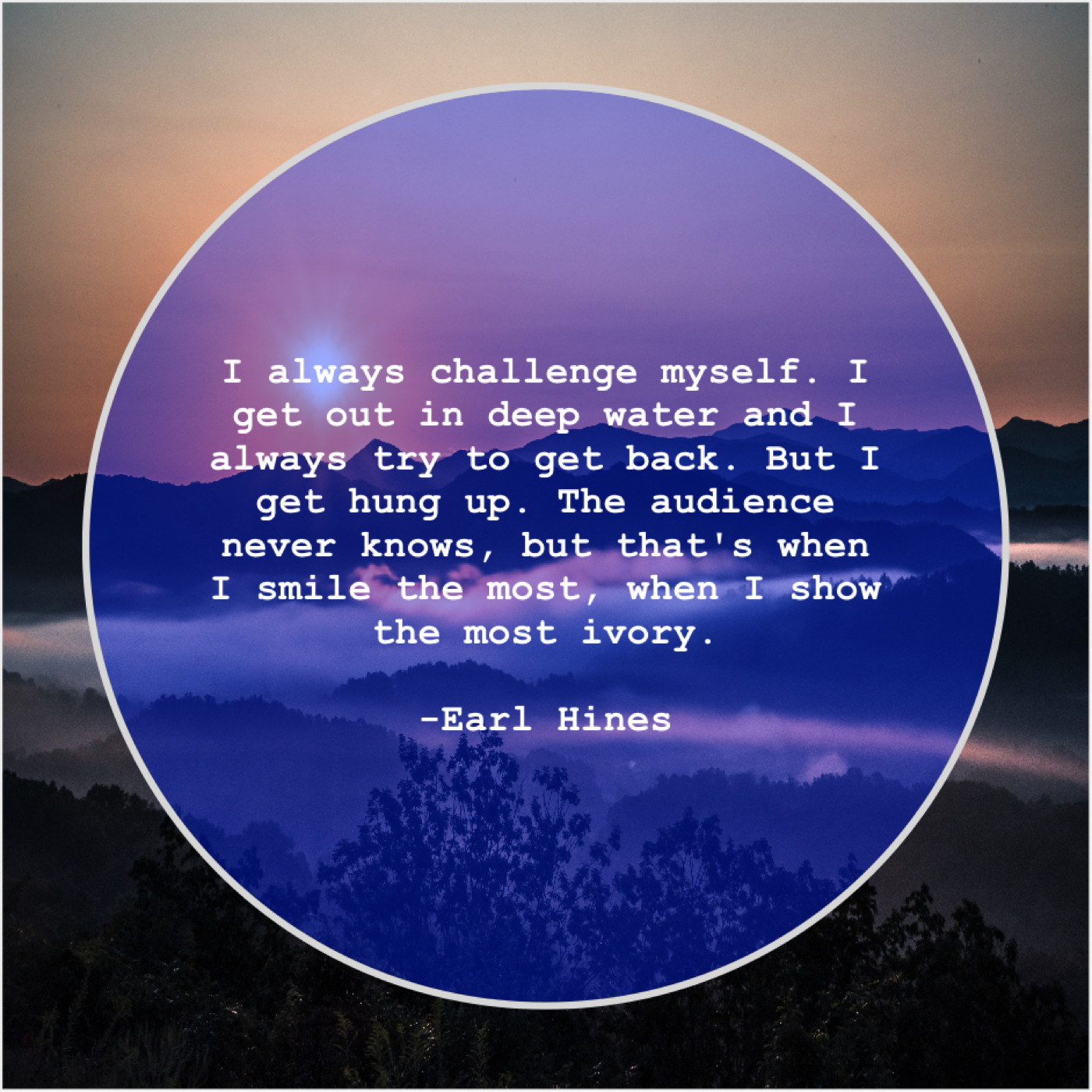 Earl Hines Earl Hines – I always challenge myself. I… September 11, 2019 admin “I always challenge myself. I get out in deep water and I always try to get back. But I get hung up. The audience never knows, but that’s when I smile the most, when I show the most ivory.”-Earl Hines