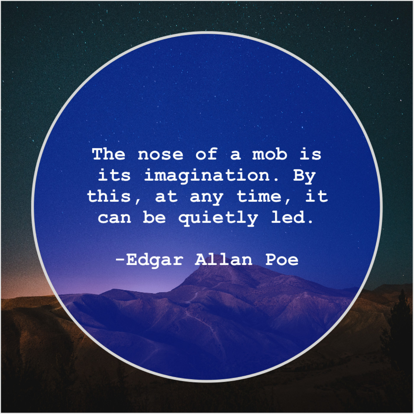 Edgar Allan Poe Edgar Allan Poe – The nose of a mob… July 8, 2019 admin “The nose of a mob is its imagination. By this, at any time, it can be quietly led.”-Edgar Allan Poe