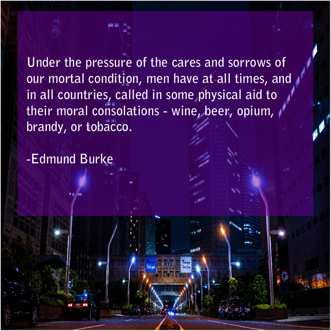 Edmund Burke Edmund Burke – Under the pressure of the… July 24, 2019 admin “Under the pressure of the cares and sorrows of our mortal condition, men have at all times, and in all countries, called in some physical aid to their moral consolations – wine, beer, opium, brandy, or tobacco.”-Edmund Burke