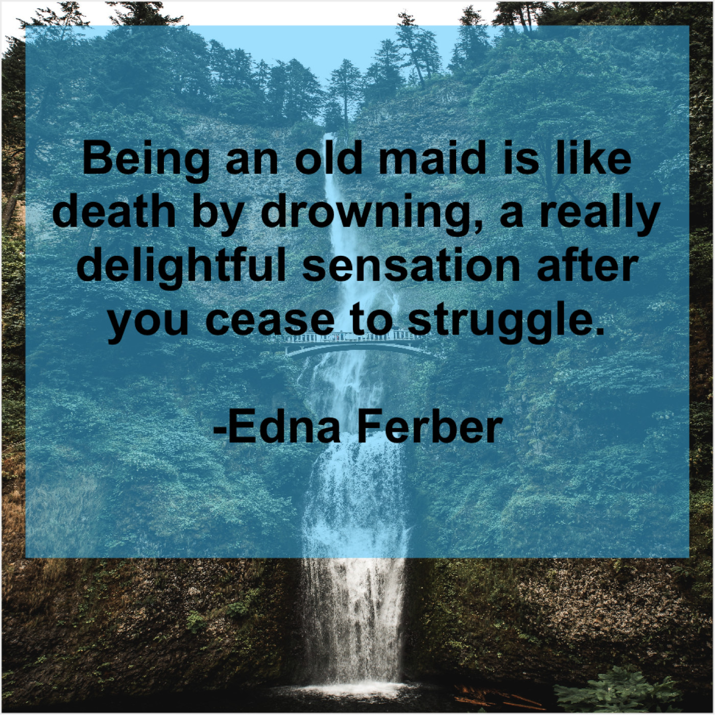 Edna Ferber Edna Ferber – Being an old maid is… April 17, 2019 admin “Being an old maid is like death by drowning, a really delightful sensation after you cease to struggle.”-Edna Ferber