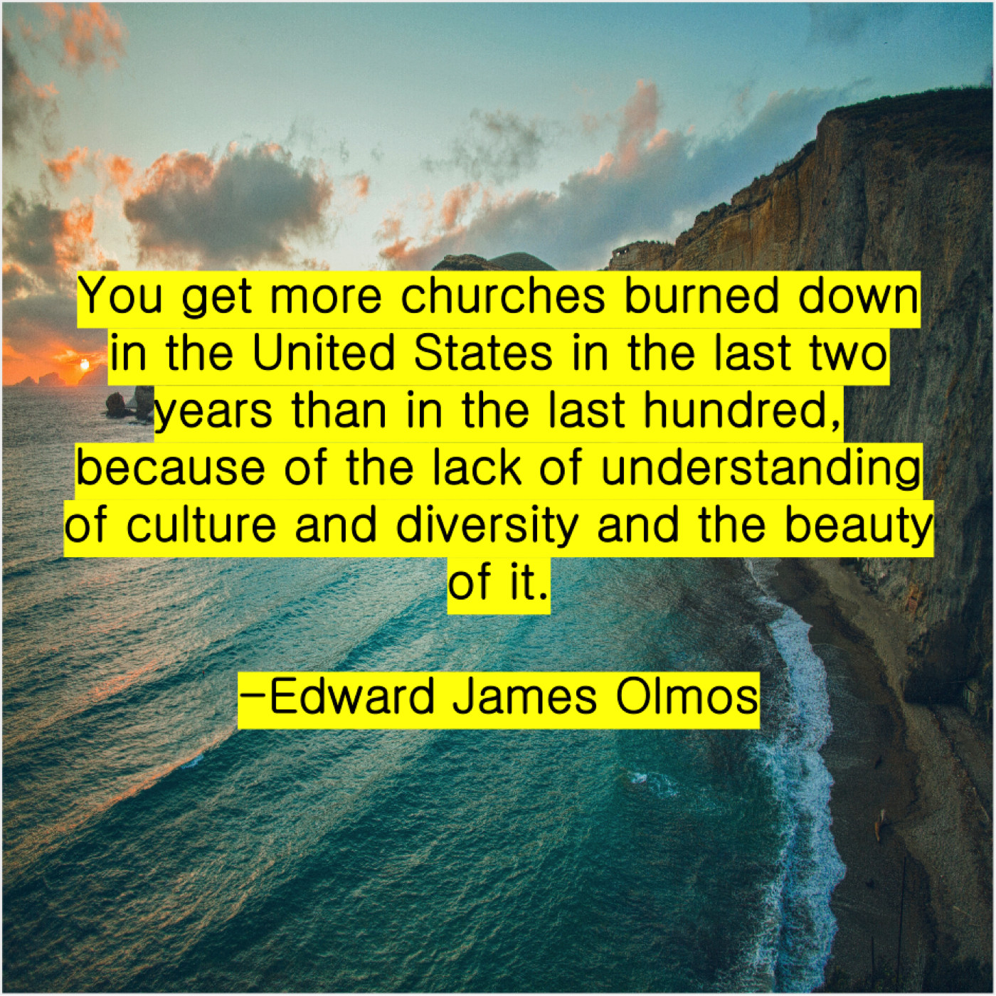 Edward James Olmos Edward James Olmos – You get more churches burned… December 20, 2018 admin “You get more churches burned down in the United States in the last two years than in the last hundred, because of the lack of understanding of culture and diversity and the beauty of it.”-Edward James Olmos