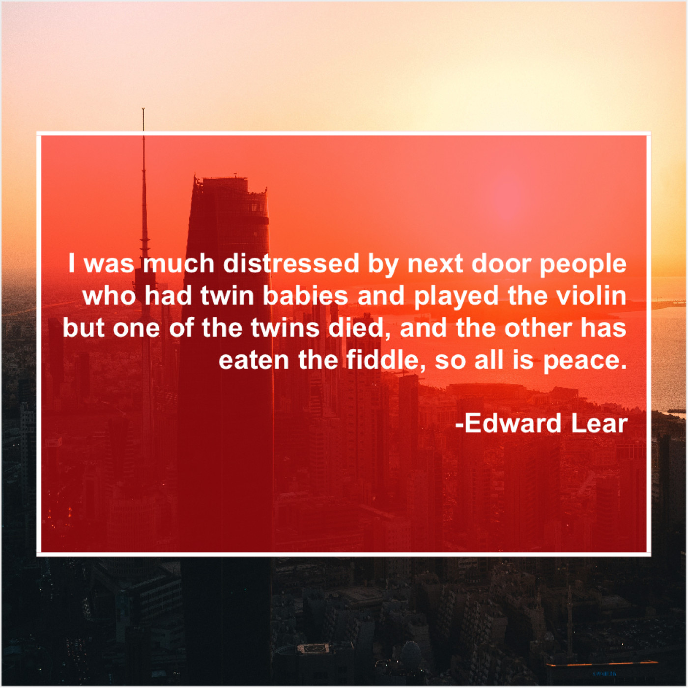 Edward Lear Edward Lear – I was much distressed by… May 10, 2019 admin “I was much distressed by next door people who had twin babies and played the violin but one of the twins died, and the other has eaten the fiddle, so all is peace.”-Edward Lear