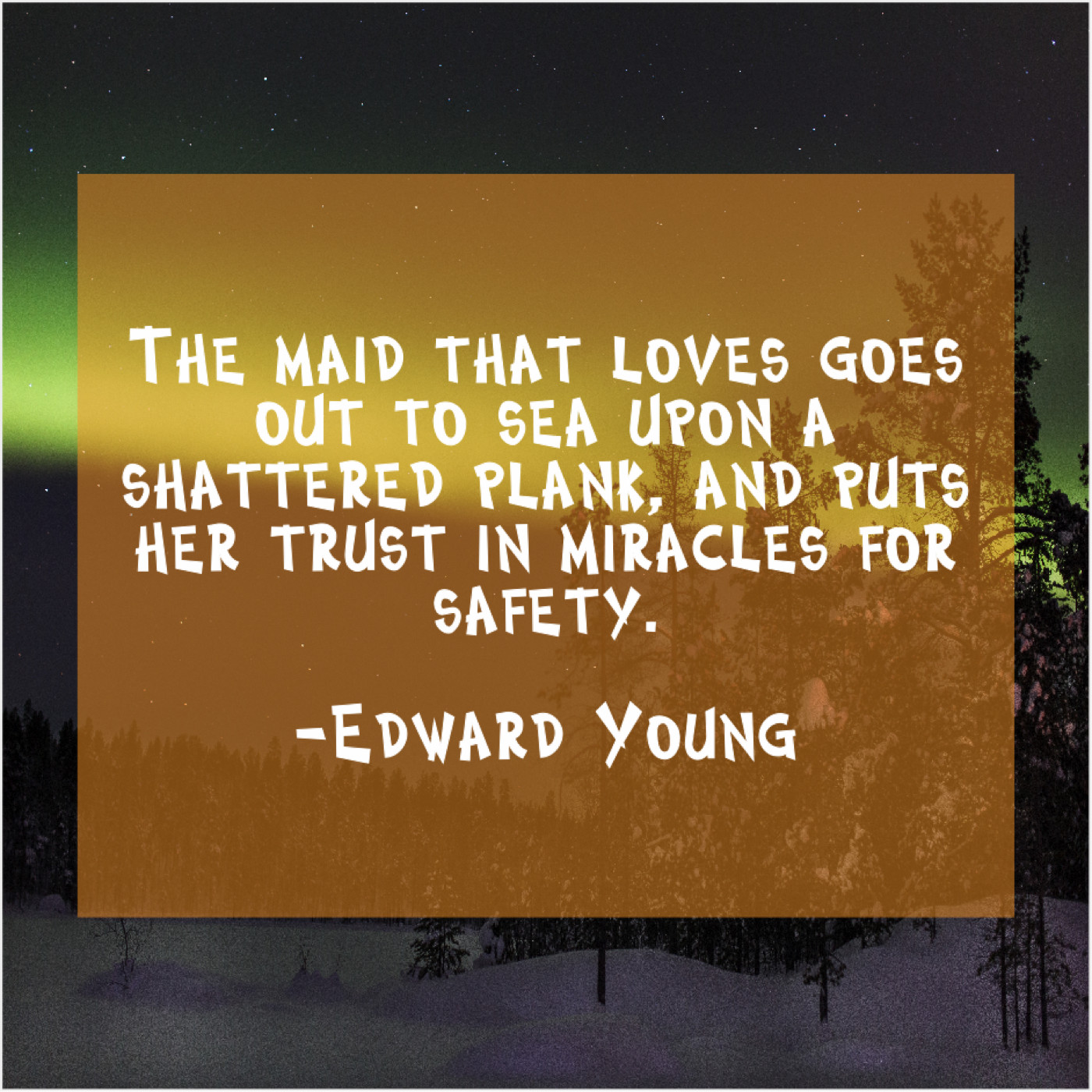 Edward Young Edward Young – The maid that loves goes… February 3, 2019 admin “The maid that loves goes out to sea upon a shattered plank, and puts her trust in miracles for safety.”-Edward Young