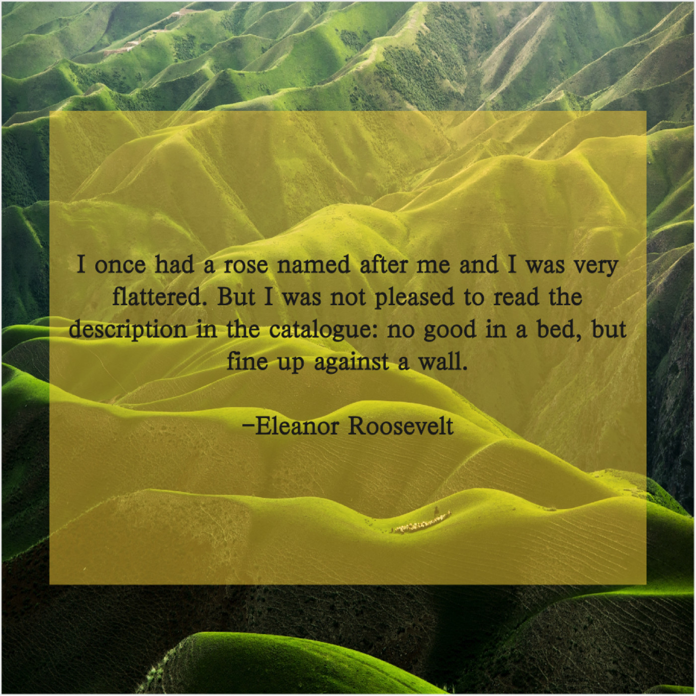 Eleanor Roosevelt Eleanor Roosevelt – I once had a rose… December 24, 2018 admin “I once had a rose named after me and I was very flattered. But I was not pleased to read the description in the catalogue: no good in a bed, but fine up against a wall.”-Eleanor Roosevelt