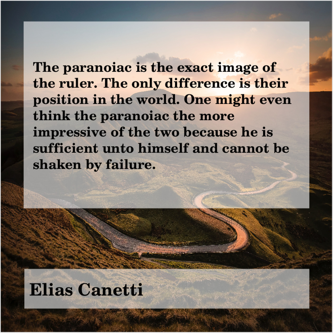 “The paranoiac is the exact image of the ruler. The only difference is their position in the world. One might even think the paranoiac the more impressive of the two because he is sufficient unto himself and cannot be shaken by failure.”
